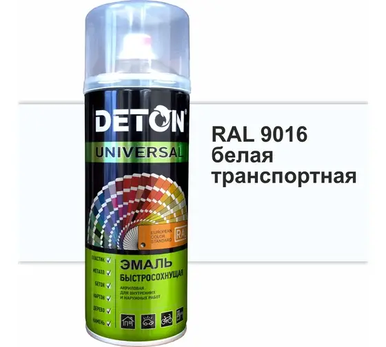 Эмаль DETON акриловая, быстросохнущая, белый транспортный, RAL 9016, аэрозоль 520 мл DTN-A07261 предназначена для покраски предварительно загрунтованных изделий из металла, дерева, камня, бетона, картона и пластика.