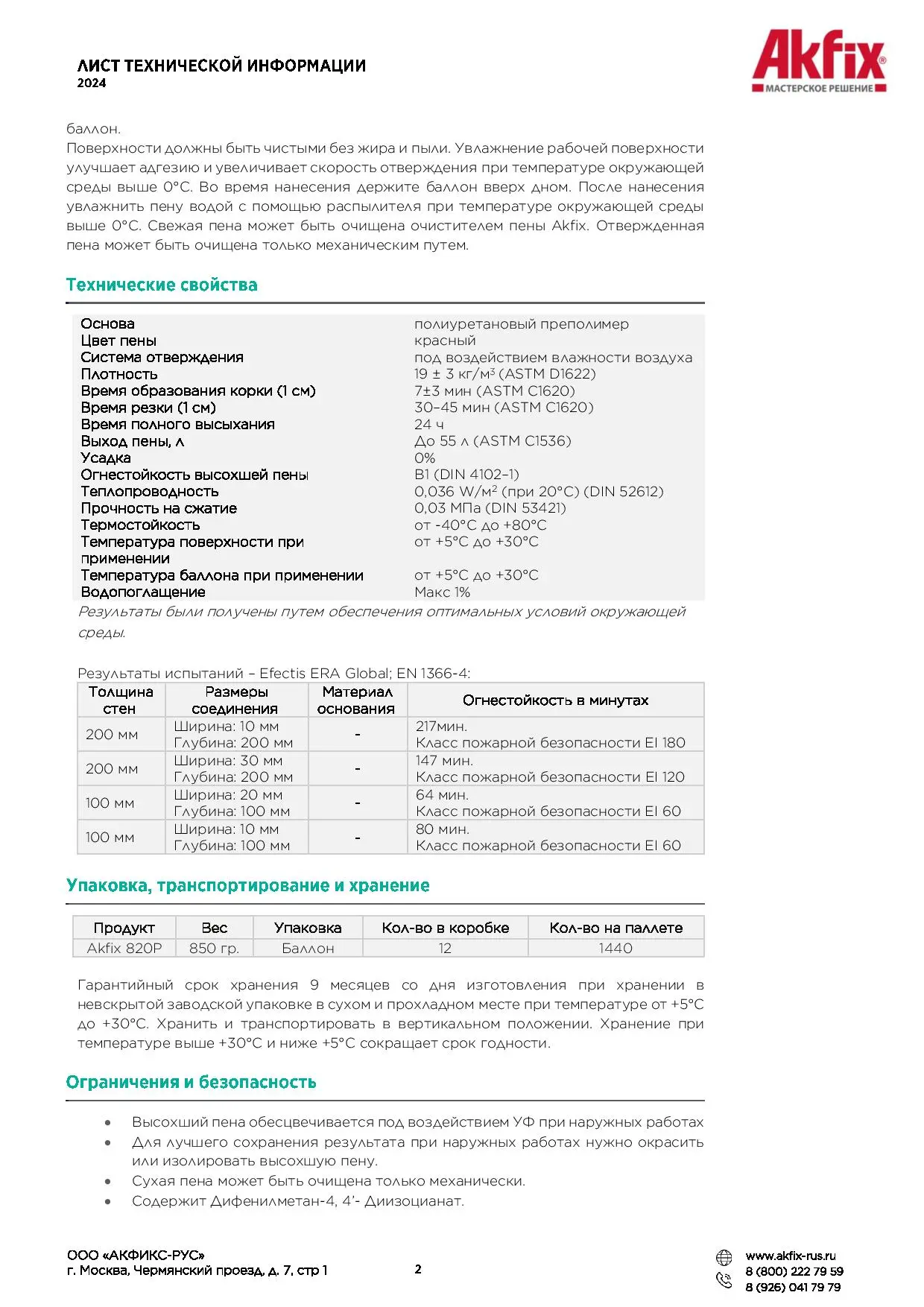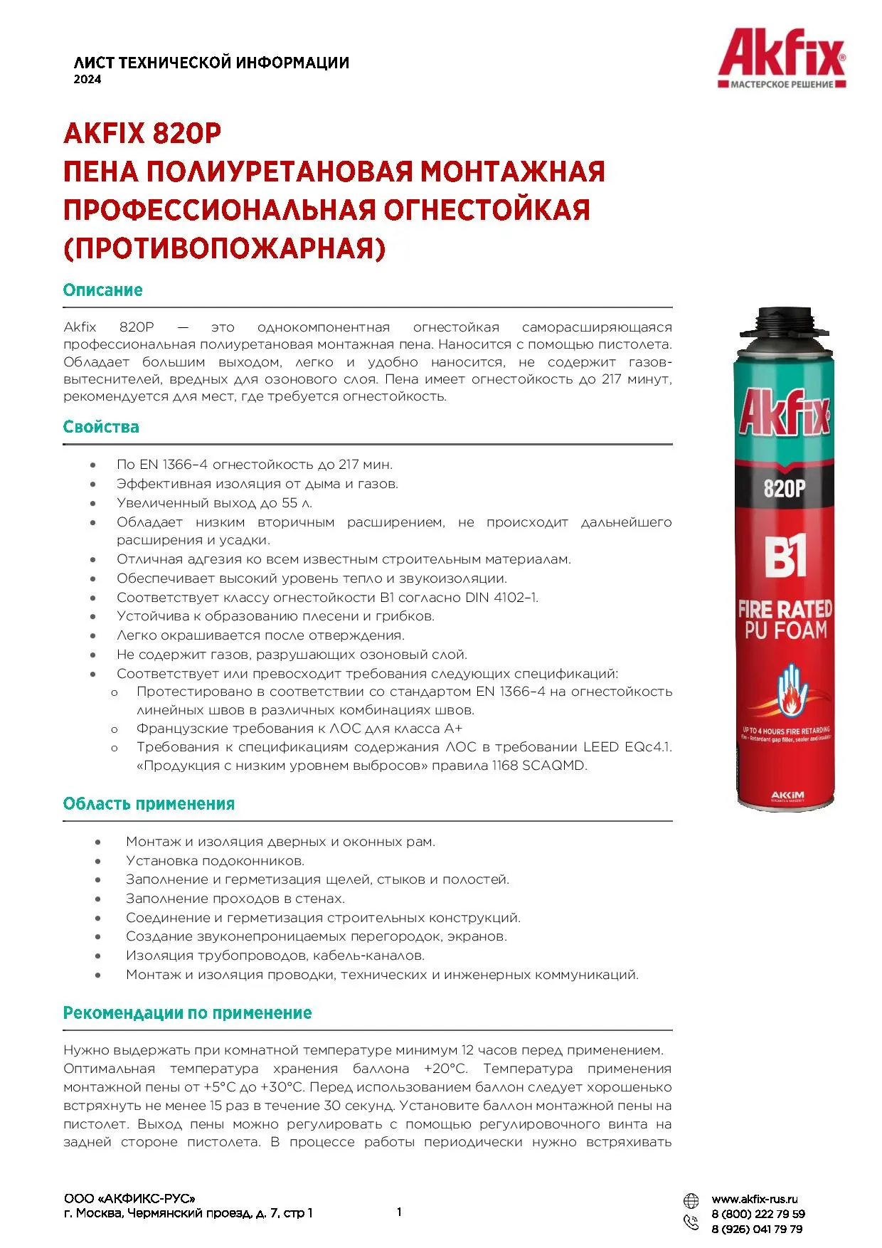 Akfix 820P — это однокомпонентная огнестойкая саморасширяющаяся профессиональная полиуретановая монтажная пена. Наносится с помощью пистолета. Обладает большим выходом, легко и удобно наносится, не содержит газов-вытеснителей, вредных для озонового слоя. Пена имеет огнестойкость до 217 минут, рекомендуется для мест, где требуется огнестойкость.