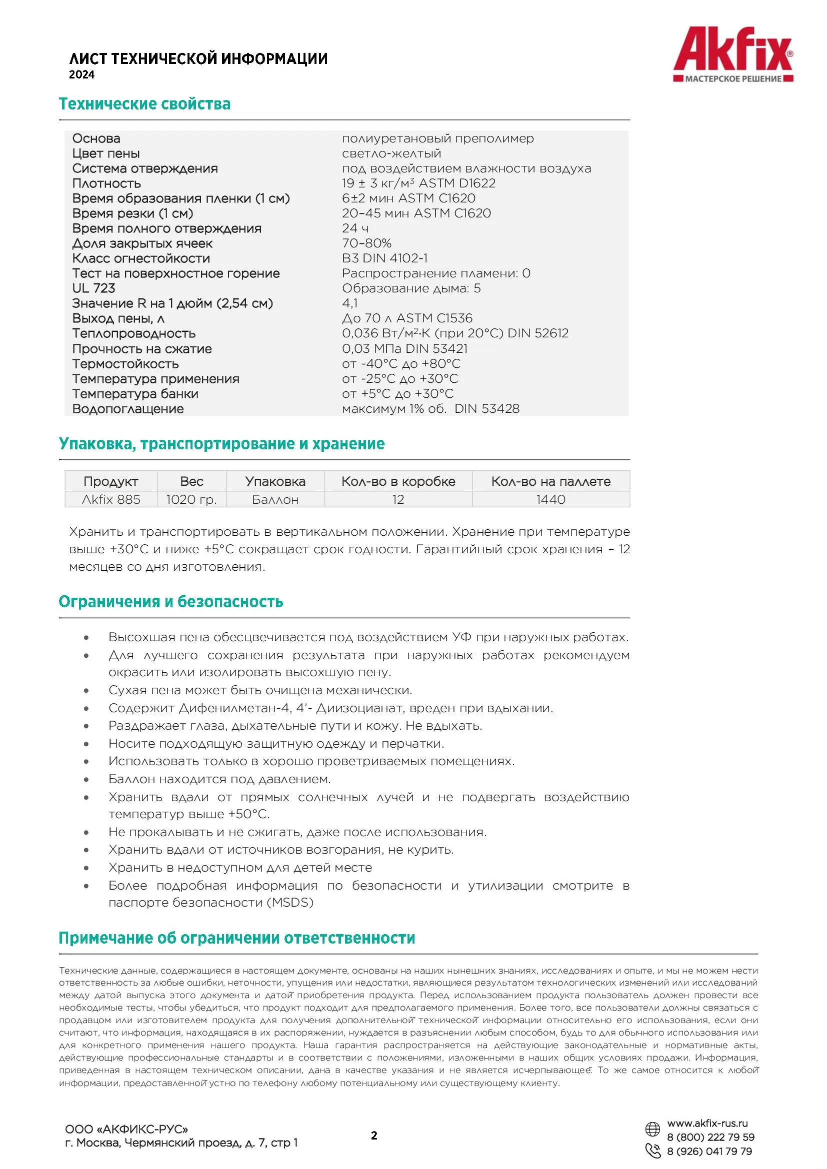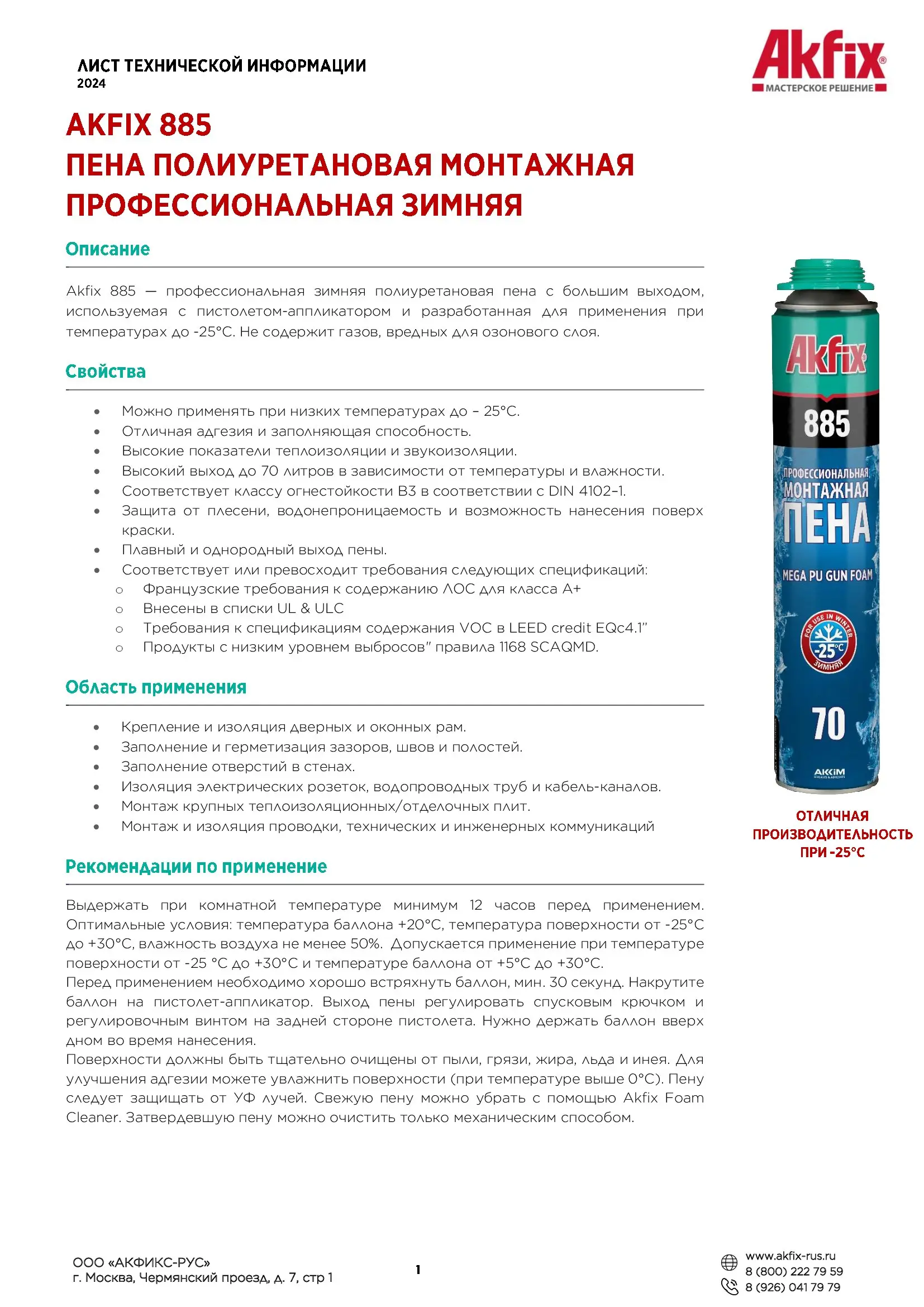 Akfix 885 — профессиональная зимняя полиуретановая пена с большим выходом, используется с пистолетом-аппликатором, разработана для применения при температурах до −25 ℃. Не содержит газов, вредных для озонового слоя.