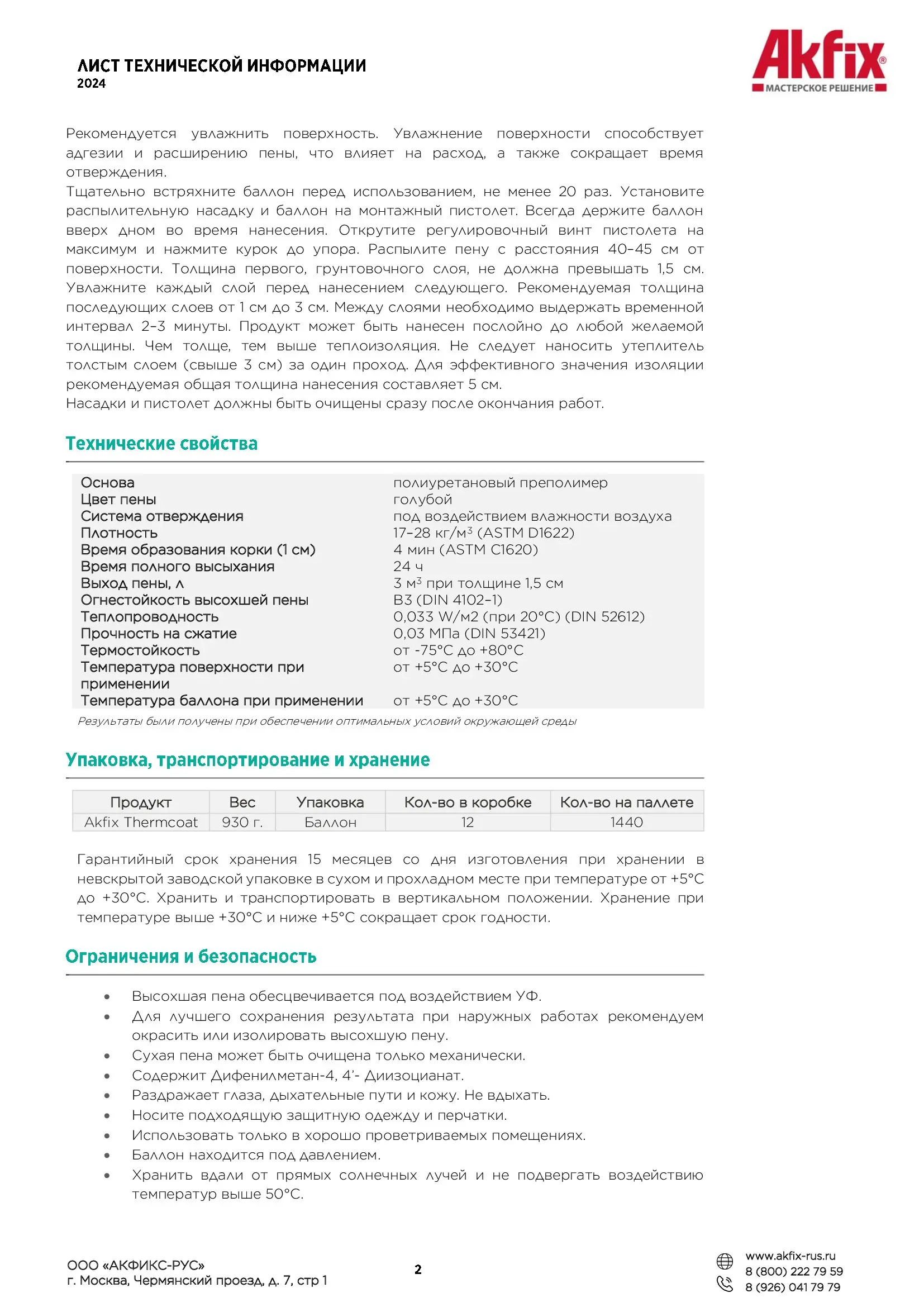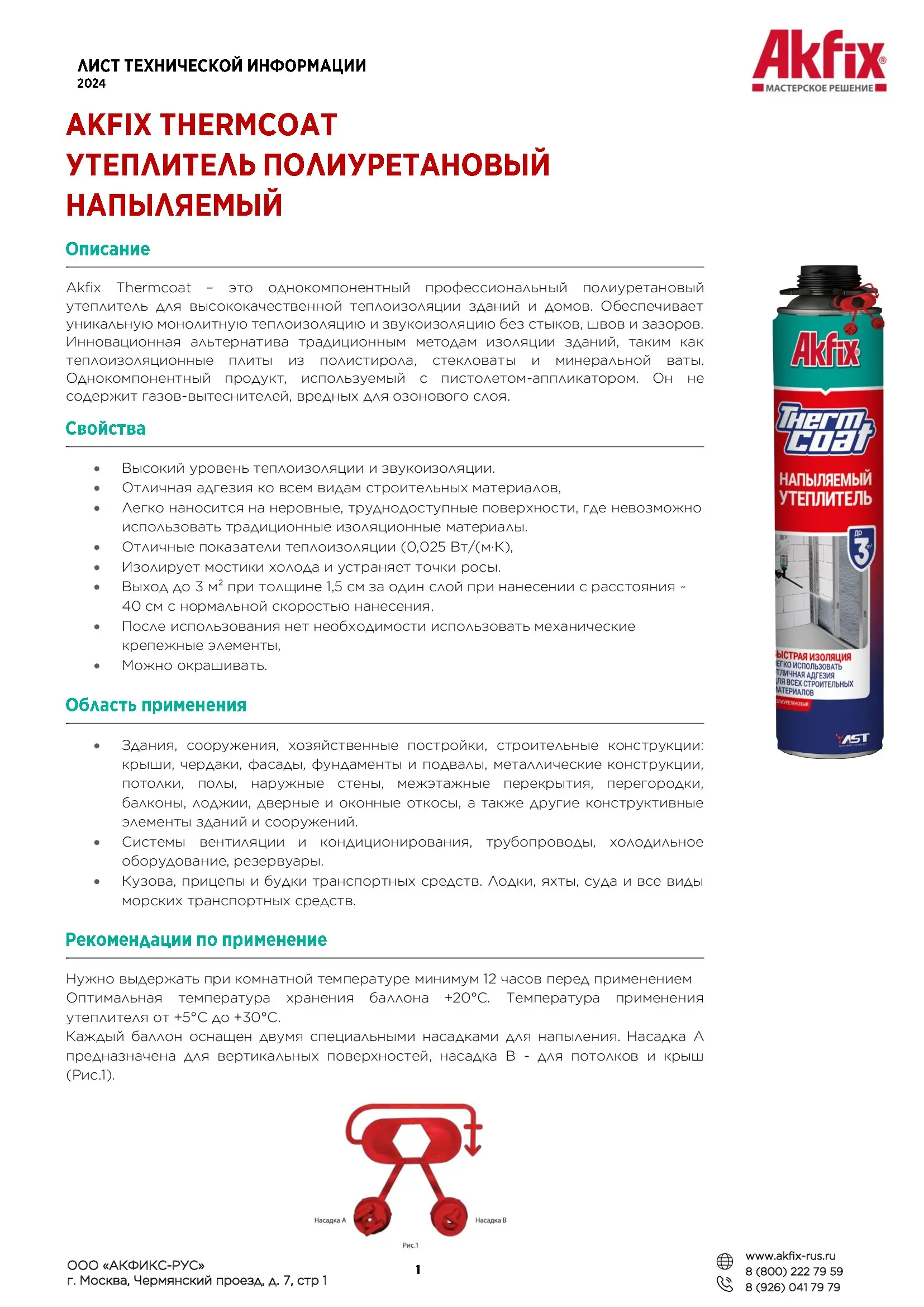 Akfix Thermcoat — это однокомпонентный профессиональный полиуретановый утеплитель для высококачественной теплоизоляции зданий и домов. Обеспечивает уникальную монолитную тепло- и звукоизоляцию без стыков, швов и зазоров.