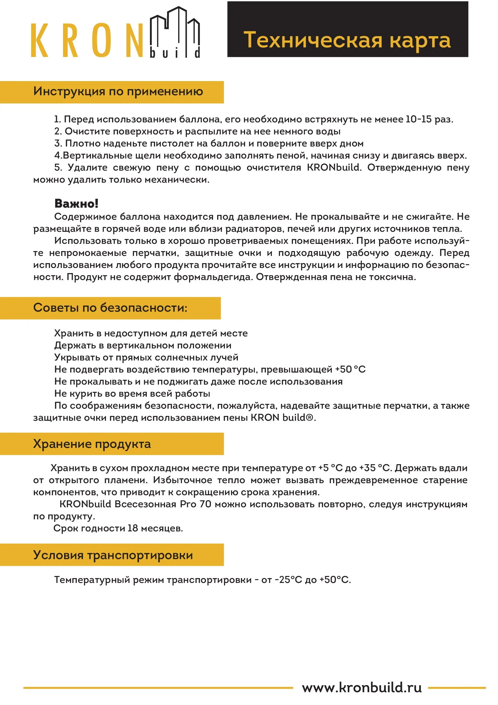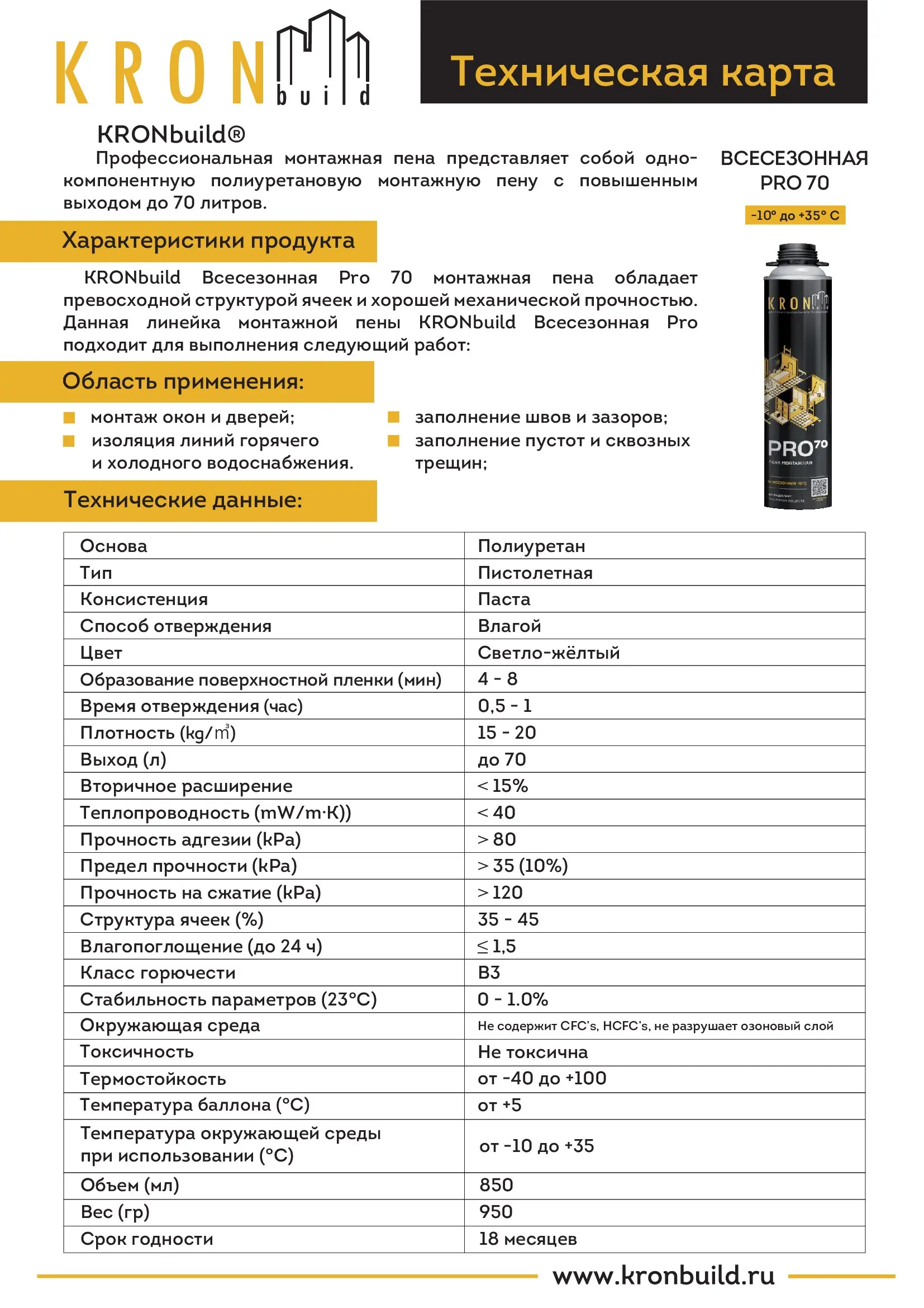 KRONbuild Pro монтажная пена с превосходной структурой ячеек и хорошей механической прочностью, данная линейка монтажной пены. Данную пену можно использовать всесезонно, так как она работает от - 10 и до +30.