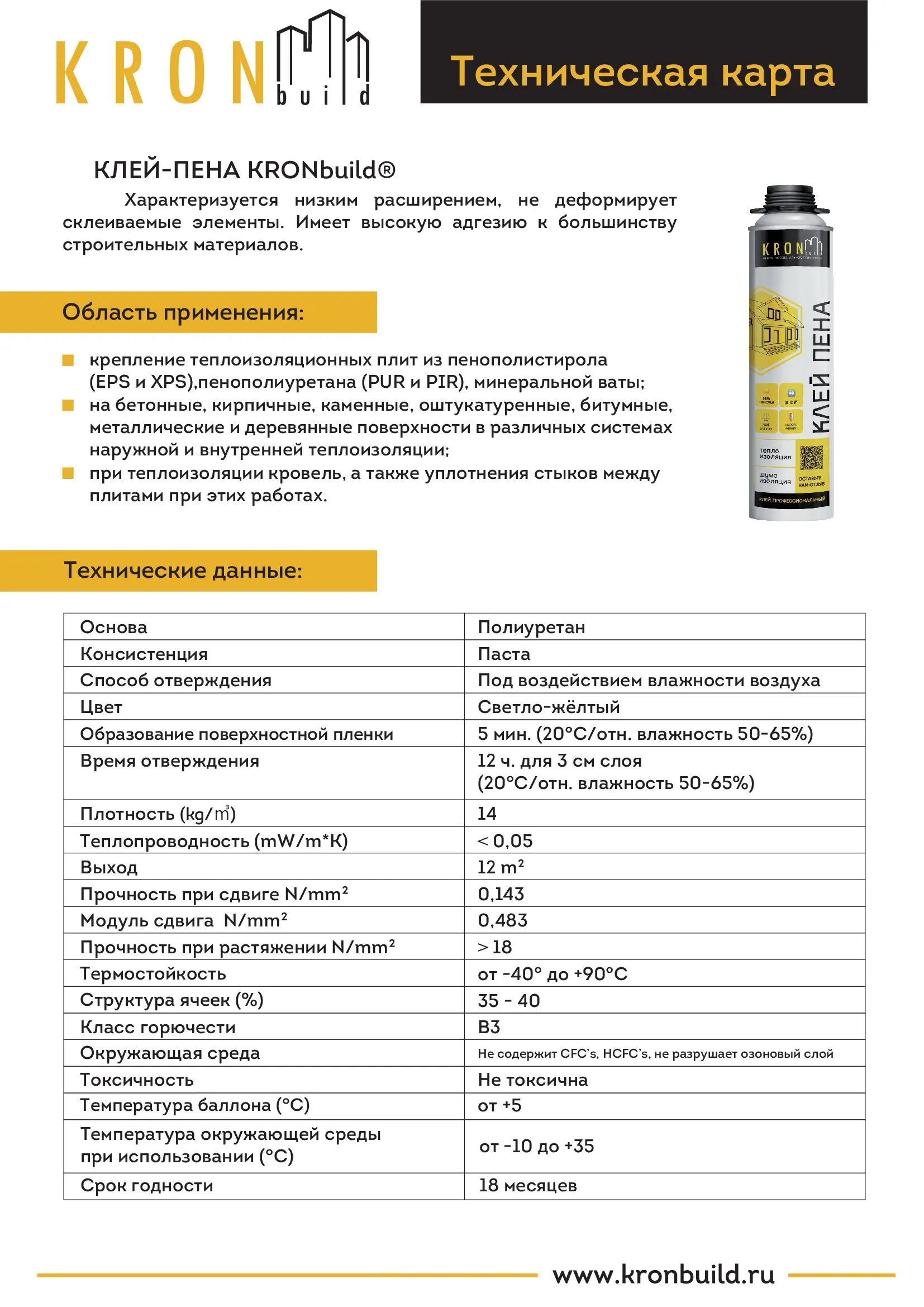 Клей-пена Kronbuild представляет собой профессиональный полиуретановый клей с увеличенной адгезией к различным основаниям. Устойчив к старению, плесени, влажности. Имеет отличную адгезию к цементным штукатуркам, бетону, плитам OSB, дереву и дсп. Основные области применения: